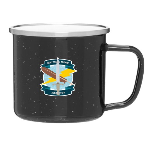 13 oz single wall enamel mug with glossy color out/ glossy white in, 18/8 stainless steel rim, and speckles