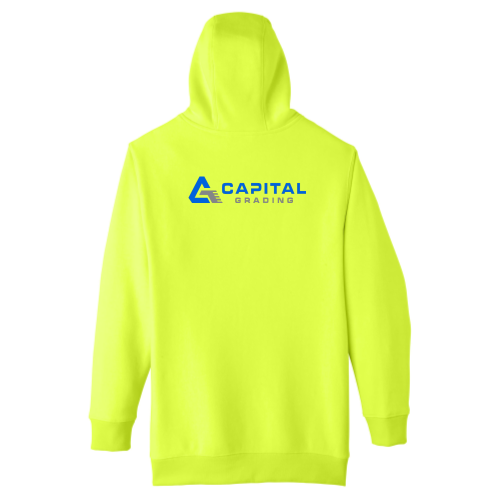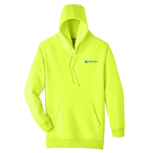 11 oz.yd2 / 373 gsm, 70% cotton, 30% polyester crossweave fleece; Safety Yellow is 50% cotton, 50% polyester; Water-repellent; Three-piece self-lined hood; Dyed-to-match flat braided drawcord at hood; Front pouch with media pocket; Matching knit trim at cuff and hem; Locker loop main label; Team fit; Easy care