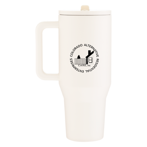 40 oz double wall 18/8 stainless steel thermal mug with copper vacuum insulation, threaded lid, matching flip-up spout, soft straw, wide handle, and powder coated finish