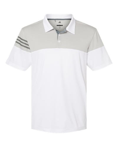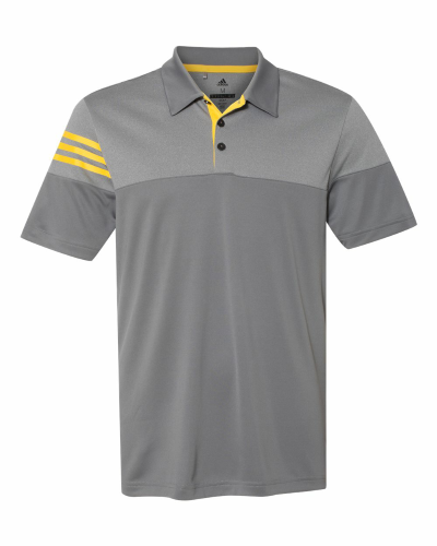 3.8 oz., 100% polyesterMoisture managementUPF 30+Self-collarContrast 3-stripes screen print on right sleeveHeather blocking on upper chest, back and shouldersContrast adidas® logo at back neck to match 3 stripes artwork on sleeveThree button placket