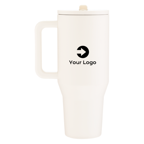 40 oz double wall 18/8 stainless steel thermal mug with copper vacuum insulation, threaded lid, matching flip-up spout, soft straw, wide handle, and powder coated finish