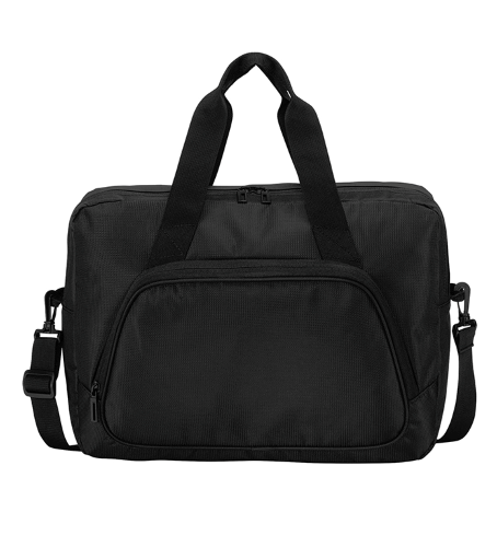 600D poly canvas; 360D poly twisted twill canvas Large zippered main compartment Interior padded laptop compartment Front zippered pocket with interior organization panel Removable, adjustable, padded web shoulder strap Metal zipper