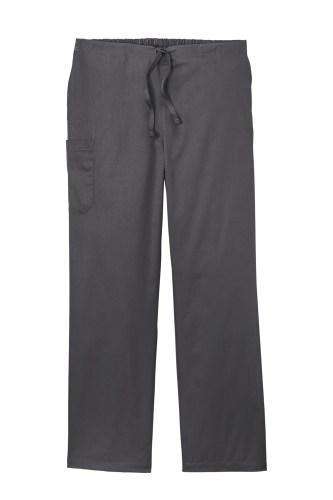 65/35 poly/cotton Mechanical stretch Flat front full drawstring and half-back elastic waistband Front slash pockets Right side cargo pocket Single back pocket Straight leg 31-inch inseam WonderWink heat transfer logo at ca